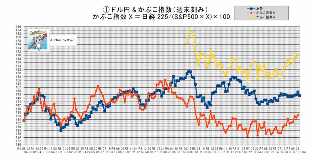 かぶこ指数4※は「170.68」でドル円との相関は「1.17」。
