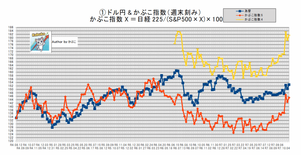 かぶこ指数4※は「181.49」でドル円との相関は「1.19」。