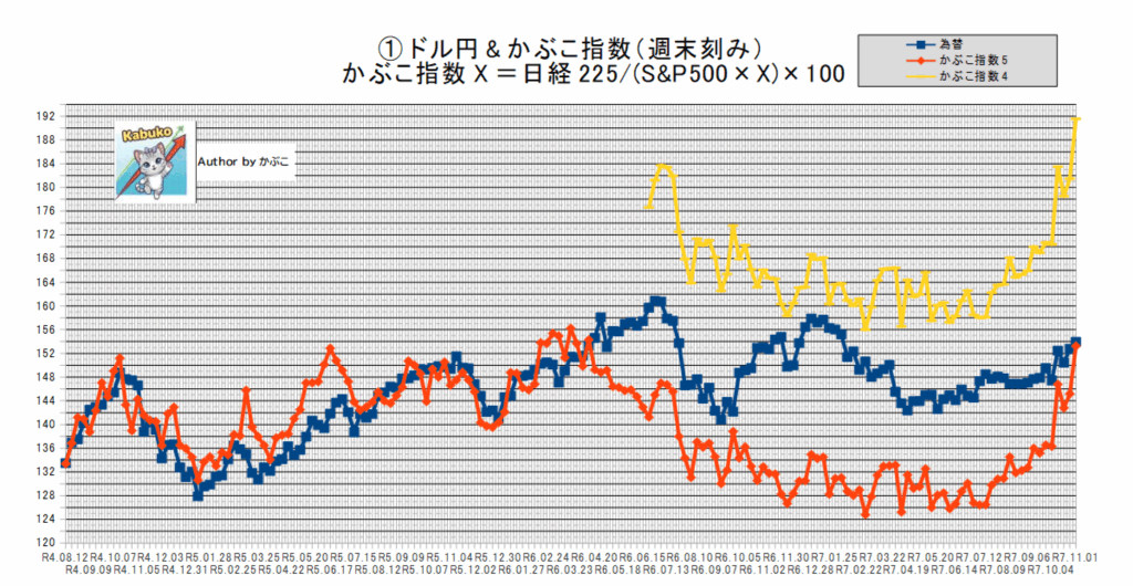 かぶこ指数4※は「191.56」でドル円との相関は「1.24」。