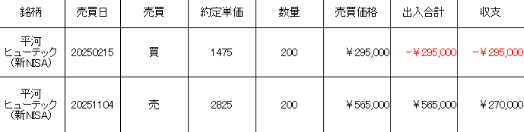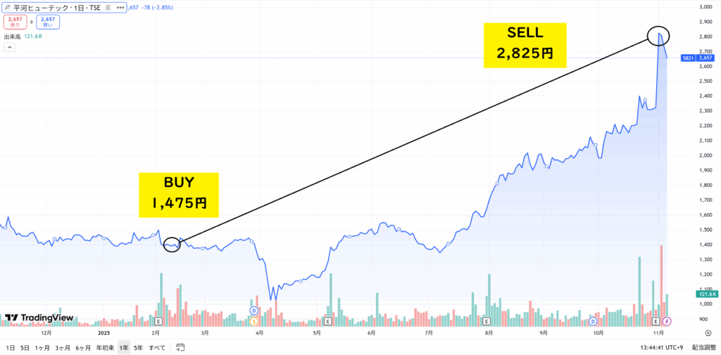 売却日の2025年11月4日、平河ヒューテック株はストップ高(S高)水準の2,825円まで急騰しました。(※要因は前週末発表の業績上方修正)