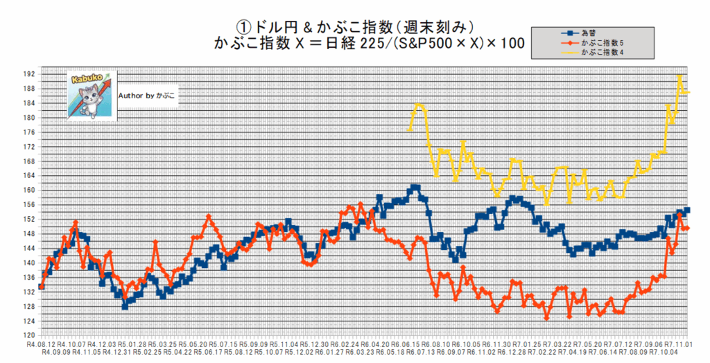かぶこ指数4※は「191.56」でドル円との相関は「1.21」。