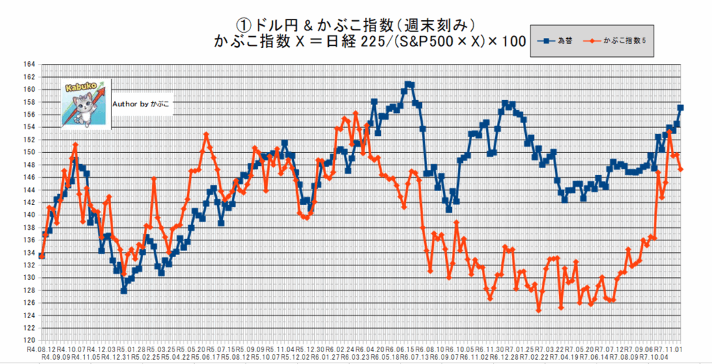 かぶこ指数5※は「147.30」でドル円との相関は「0.94」。
