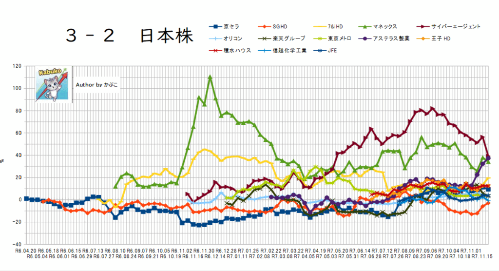 - 日本株は11月頭の高値から急落。期待していたサイバーエージェントは好決算なのに下落し、信越化学はついに含み損へ転落。