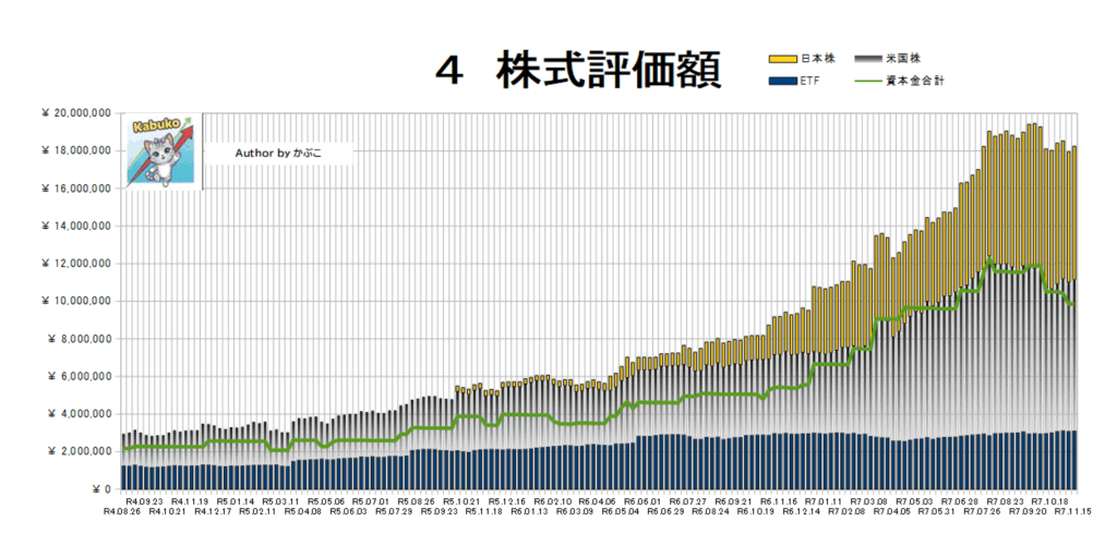 - 結果、総評価額は¥18,211,226(前週比 約-4万円)と、荒れ気味の相場の割には「奇跡的な誤差」の範囲で着地。不本意ながら円安に救われた一週間となりました。
