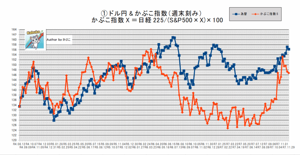 かぶこ指数5※は「146.75」でドル円との相関は「0.94」。