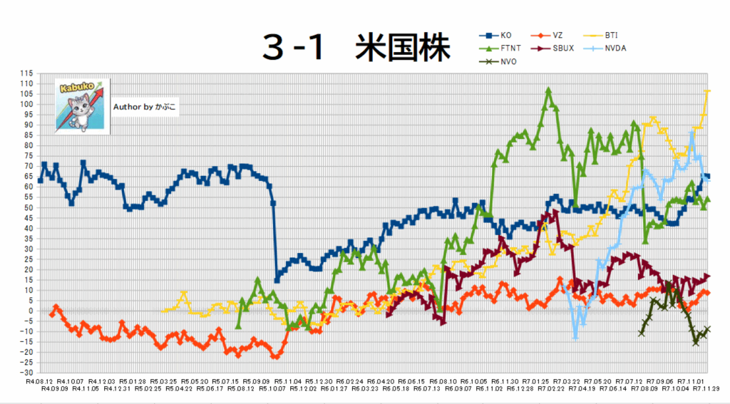 - 米国株ではディフェンシブ銘柄のBTI(タバコ)が遂にダブルバガー(2倍)を達成し、力強くポートフォリオを牽引。また、前週含み損転落した信越化学も勢いよく反発するなど、個別銘柄のドラマが相次ぎました。