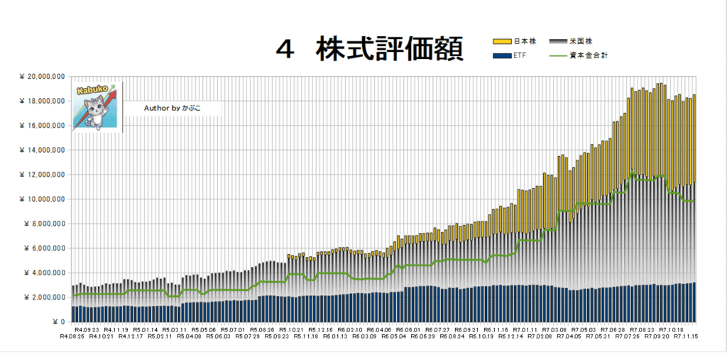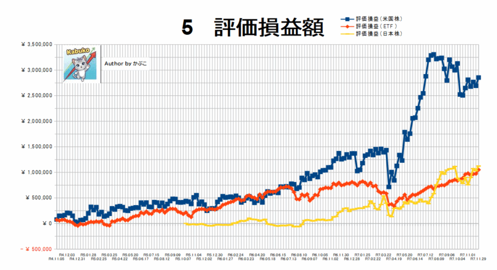 - 評価額が前週比+30万円、損益額は一気に+869万円を突破し、過去最高益を更新!ETF、米国株、日本株の全分野が好調に推移し、V字回復を達成しました。