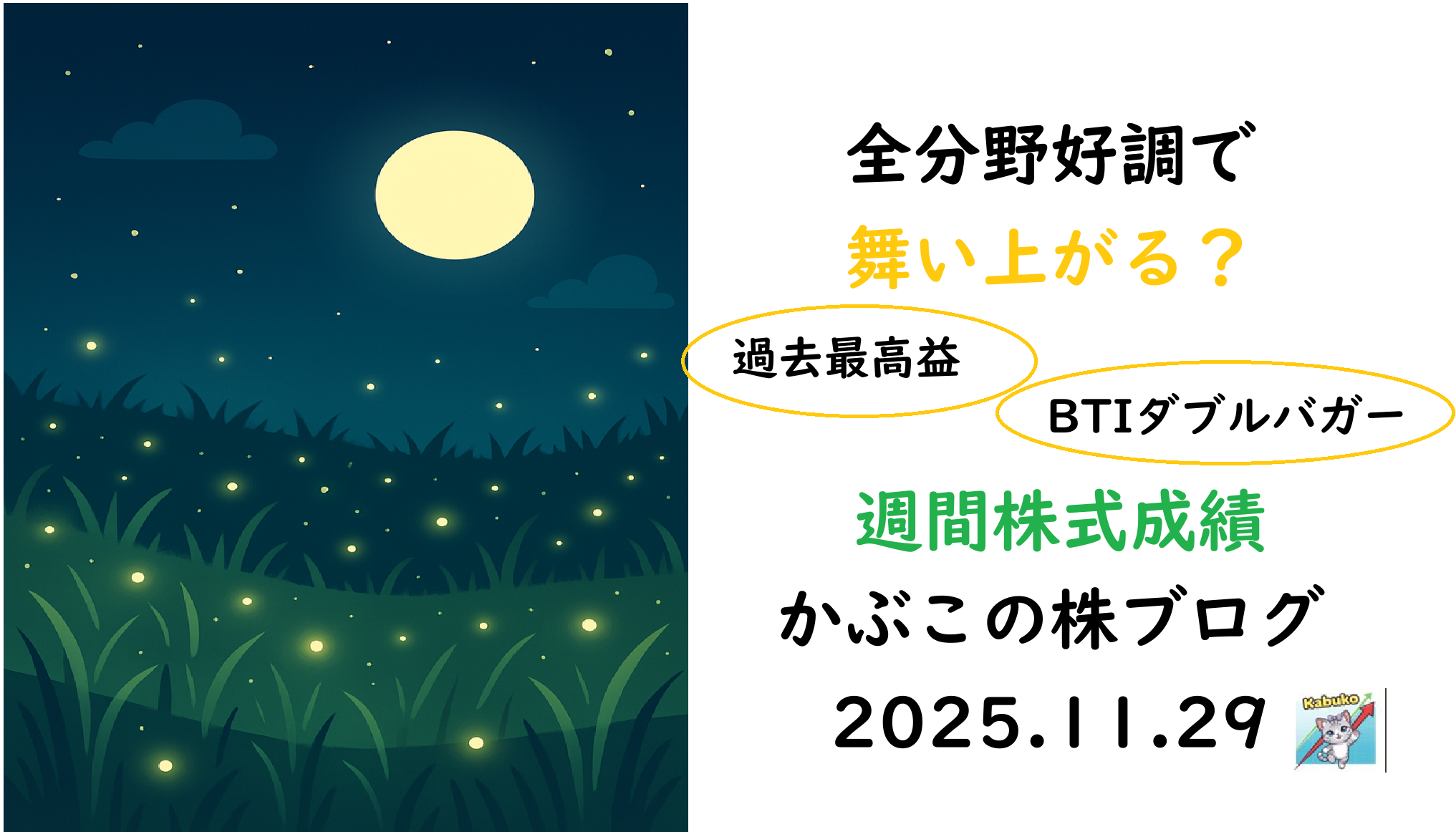 - 米国株ではディフェンシブ銘柄のBTI(タバコ)が遂にダブルバガー(2倍)を達成し、力強くポートフォリオを牽引。また、前週含み損転落した信越化学も勢いよく反発するなど、個別銘柄のドラマが相次ぎました。