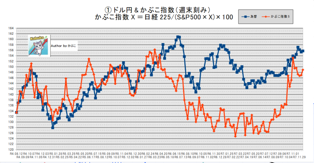 かぶこ指数5※は「148.93」でドル円との相関は「0.96」。