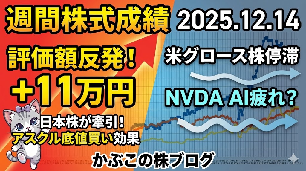 - 評価額は先週の調整から反発し、約+11万円の増加となりました。これは、アスクル(2678)の新規購入と、個別銘柄の上げ下げがマチマチだったものの日本株全体が評価額を押し上げたことが主因です。