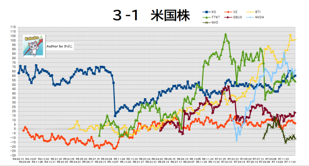 - 米国株ポートフォリオは、NVDA(エヌビディア)の反発と円安の影響で+13万円と好調でした。一方でNVO(ノボノルディスク)が-11%超と大きく崩れており、現在は「こらえ時」の局面を迎えています。