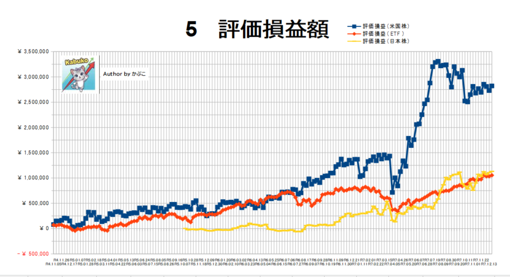 - 日銀が利上げを発表したものの、週末には157円台まで急速に円安が進行しました。この「円安ブースト」により、米国株やETFの評価額が押し上げられ、全体で約18万円の増加となりました。