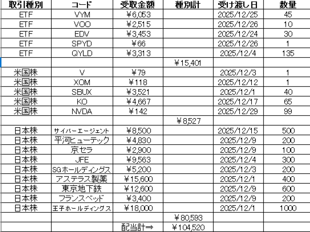 • 米国株(KO, SBUXなど)とETFに加え、日本株からの入金が重なり、ひと月あたりの受取額が初めて10万円を超えました。米国株のみでスタートした5年前からの積み重ねが、大きな成果となって結実しました。