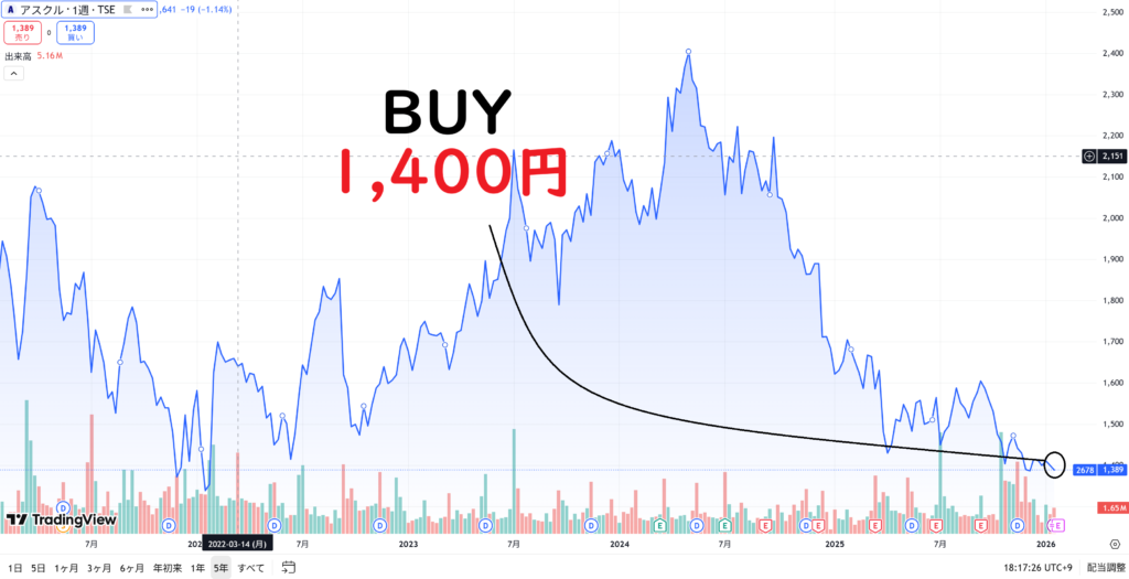 • アスクル(1,400円):決算延期などの懸念はありますが、1,400円は過去の推移から見ても底値圏。リスクを考慮しつつ「最低単元の100株」に抑えることで、致命的なダメージを避けながら優待権利を確保しました。