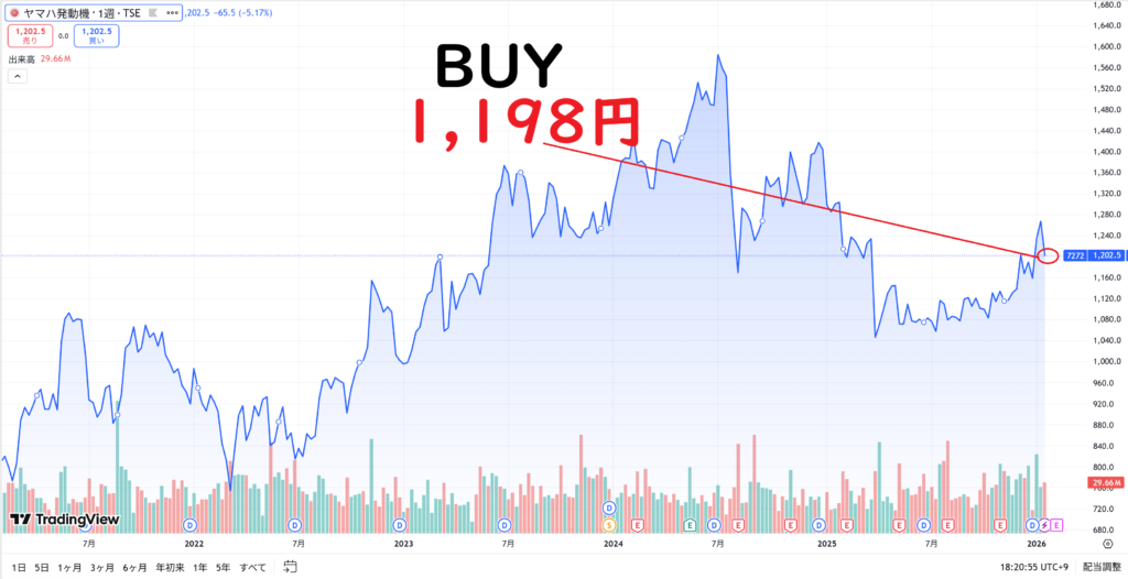 • ヤマハ発動機(1,198円):直近の下落により、配当利回りが4.16%まで上昇した絶好のタイミング。1,200円を割り込んだ位置でのエントリーは、長期保有前提なら非常に妥当性が高い「押し目買い」と言えます。