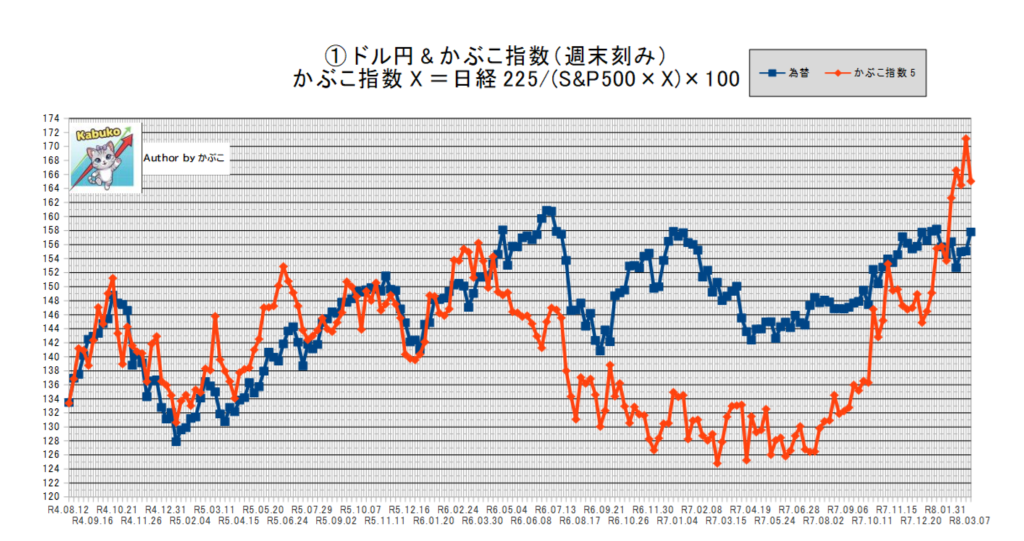 かぶこ指数5※は「165.04」でドル円との相関は「1.05」。