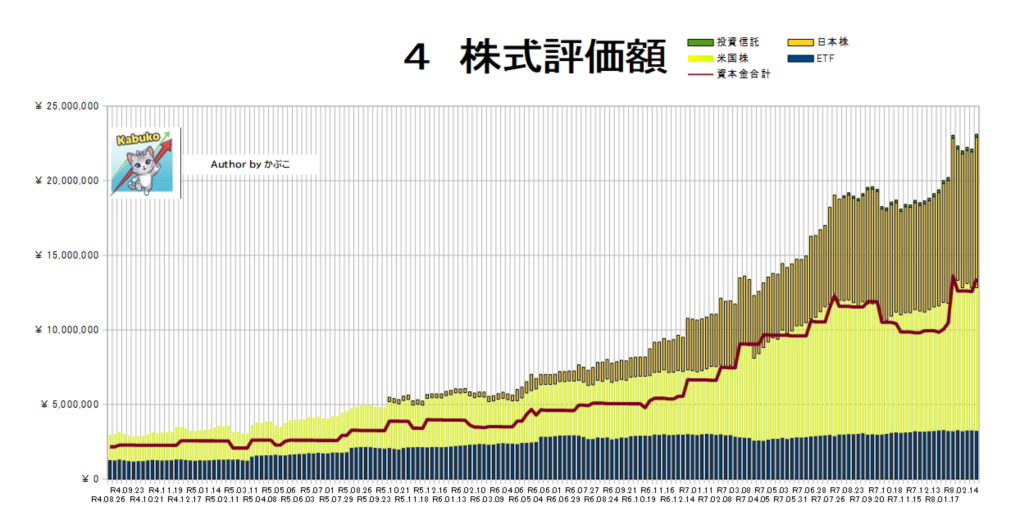 コツコツと積み上げてきた日本株への投資が実を結び、ついにポートフォリオ内での評価額が米国株を逆転(日本株43.6%:米国株41.5%)。