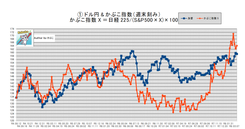 かぶこ指数5※は「164.07」でドル円との相関は「1.03」。