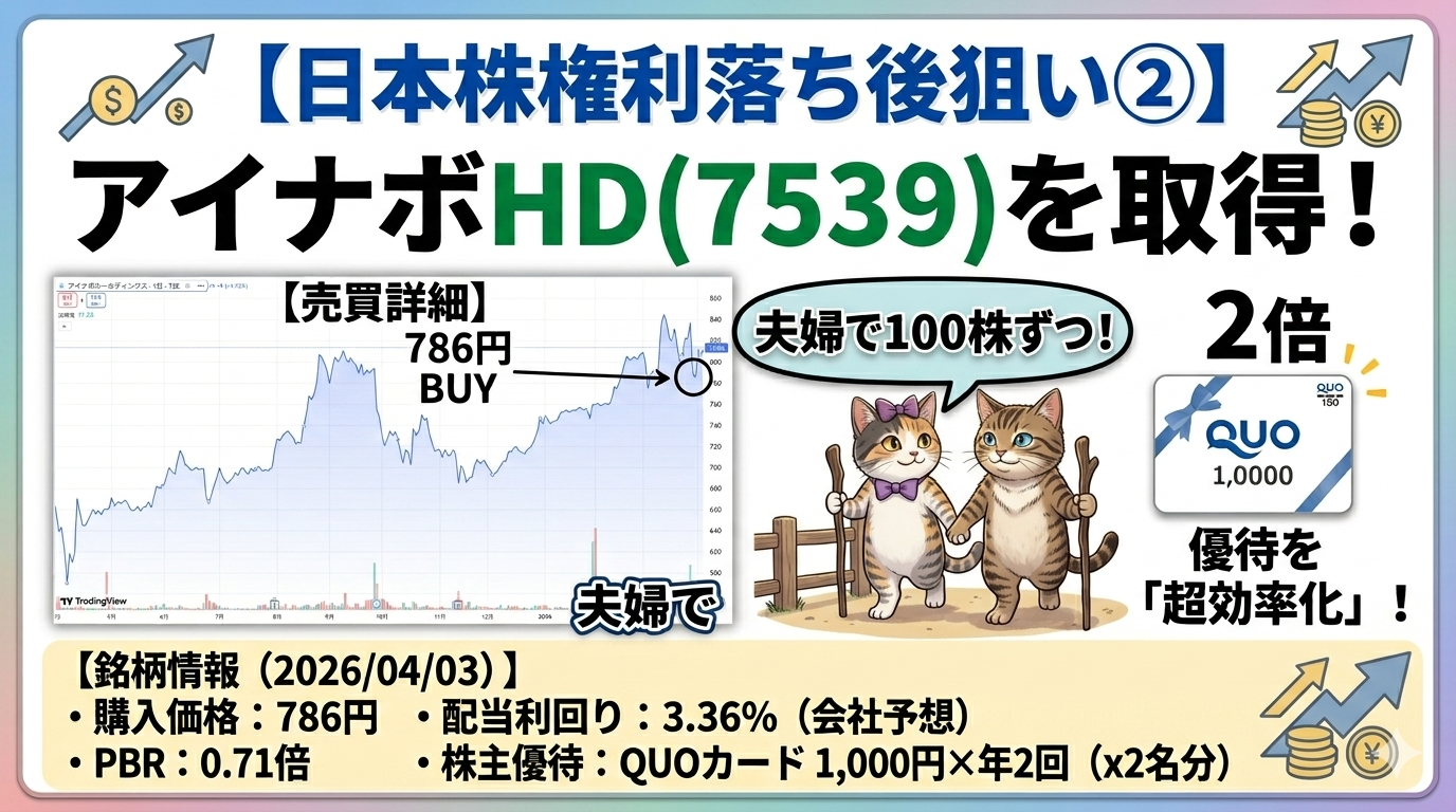 アイナボHDの優待は「100株以上でQUOカード1,000円分」ですが、実は株数を増やしても優待額が比例して増えるわけではありません。