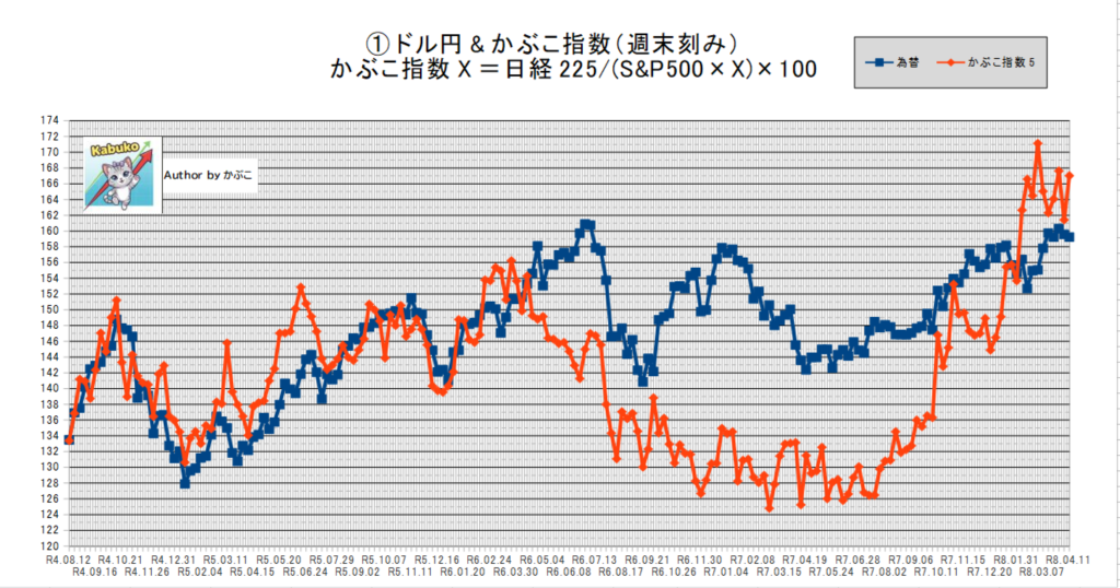 かぶこ指数5※は「167.03」でドル円との相関は「1.05」。