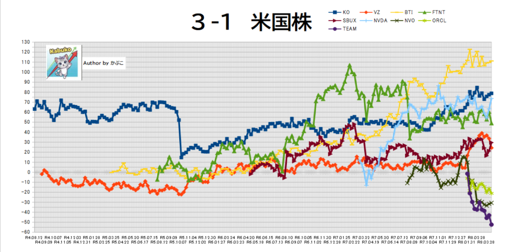 NVDA頑張るもTEAM、ORCLが足を引っ張りまさかの、-3万円。