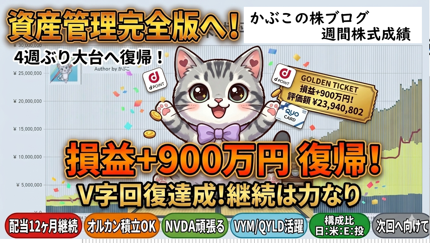 指数の力強い戻りと継続的な積み立てにより、4週間ぶりに損益が+900万円台に到達しました。