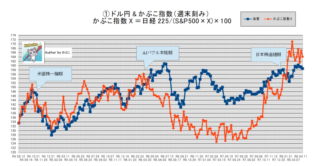 かぶこ指数5※は「164.12」でドル円との相関は「1.03」。