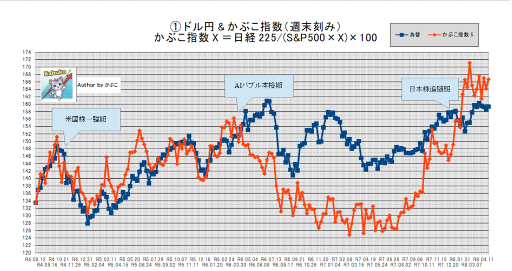 かぶこ指数5※は「166.69」でドル円との相関は「1.05」。